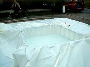 Nach einer ausführlichen Unterweisung über Theorie und Einsatztaktiken durch den stellv. Strahlenschutz-Leiter Jürgen Albert konnten die Übungsteilnehmer der FF Markt Bibart vor dem Gerätehaus einen sogenannten "Not-Dekontanimationsplatz" aufbauen (siehe Bilder). Dieser dient als Grundfläche für den Gerätewagen Gefahrgut (=GWG) aus Bad Windsheim, welcher bei einem derartigen Einsatzszenario immer mit alarmiert wird.