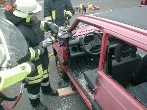 verschiedene Techniken der Menschenrettung aus einem KFZ erprobt. Übungsleiter Uwe Reuther hatte dazu ein altes Fahrzeug zu den o.g. Versuchszwecken beschafft. Neben den bereits bekannten "Standards" wurde auch das sogenannte Münchner
