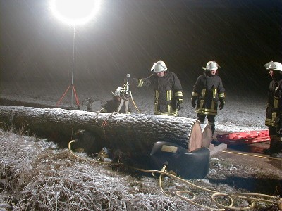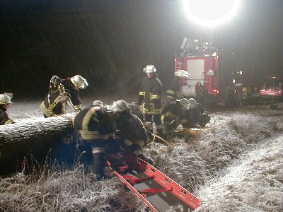 Gruppenführer Reuther Uwe leitete den Einsatz unter den kontrollierenden Blicken des Kommandanten Stütz Helmut und seines Stellvertreters Haas Klaus. Die Unfallstelle wurde vom Fahrzeugeigenen Lichtmast und über ein weiteres Statif mit Halogentrahlern ausgeleuchtet. Der erste Stamm der die Füße der Person unter sich begraben hatte,