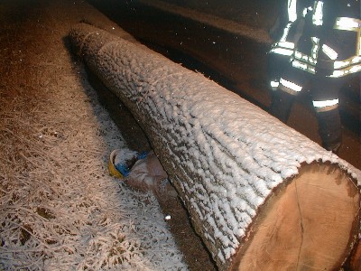 wurde mittels Spreizer, der den Baum anhob, befreit. Zur Sicherung des zweiten Baumes wurden die Bäume mittels einer Kette und den Spreizer zusammen gezogen. Mit zwei Lufthebekissen wurde nun der Zweite Baum angehoben, die darunterliegende Person wurde geborgen und mit Hilfe der Schleifkorbtrage vom Unfallgeschehen entfernt.