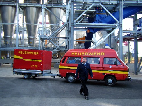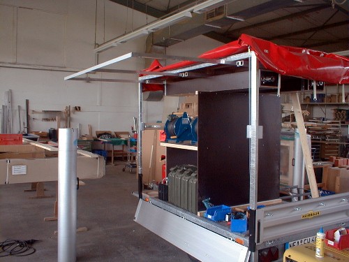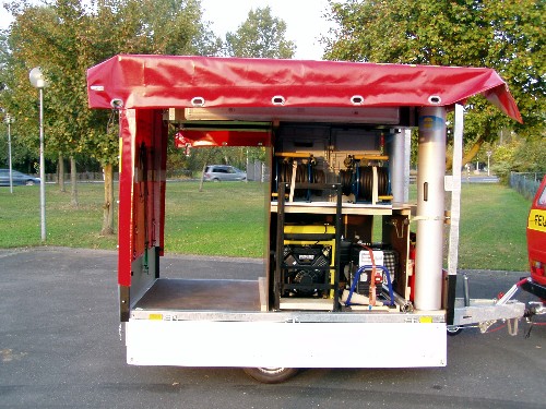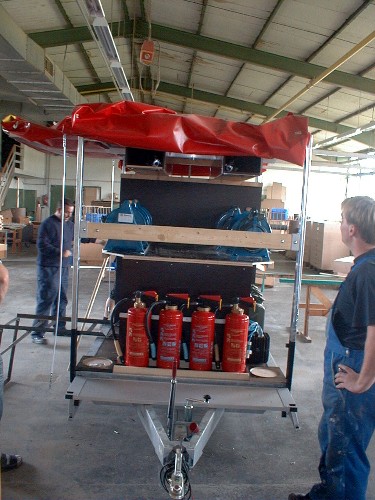 Auf der Vorderseite des Anhängers sind in verschiedenen Ebenen Behälter mit Kleinteilen Verstaut, sowie vier Feuerlöscher.