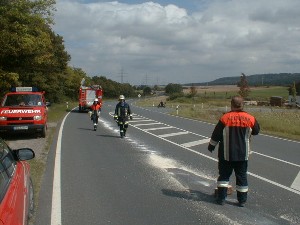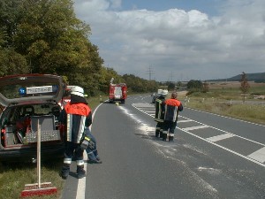 Aufgrund eines Motorschadens verlor ein LKW sehr viel Motorenoel. Im Bereich Oberlaimbach bis zum Ortsanfang Markt Bibart ( etwa 3,5 Km ) ergoß sich eine mehr oder weniger große Oelspur, die von den Wehren aus Markt Bibart und Scheinfeld beseitigt werden mußte.