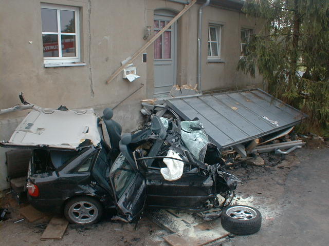 kam von der Fahrbahn nach links ab und kollidierte mit einen Treppenaufgang eins unbewohnten Hauses. Das Fahrzeug, der Treppenaufgang und die Überdachung des Aufgangs wurden bei den Aufprall total zerstört.